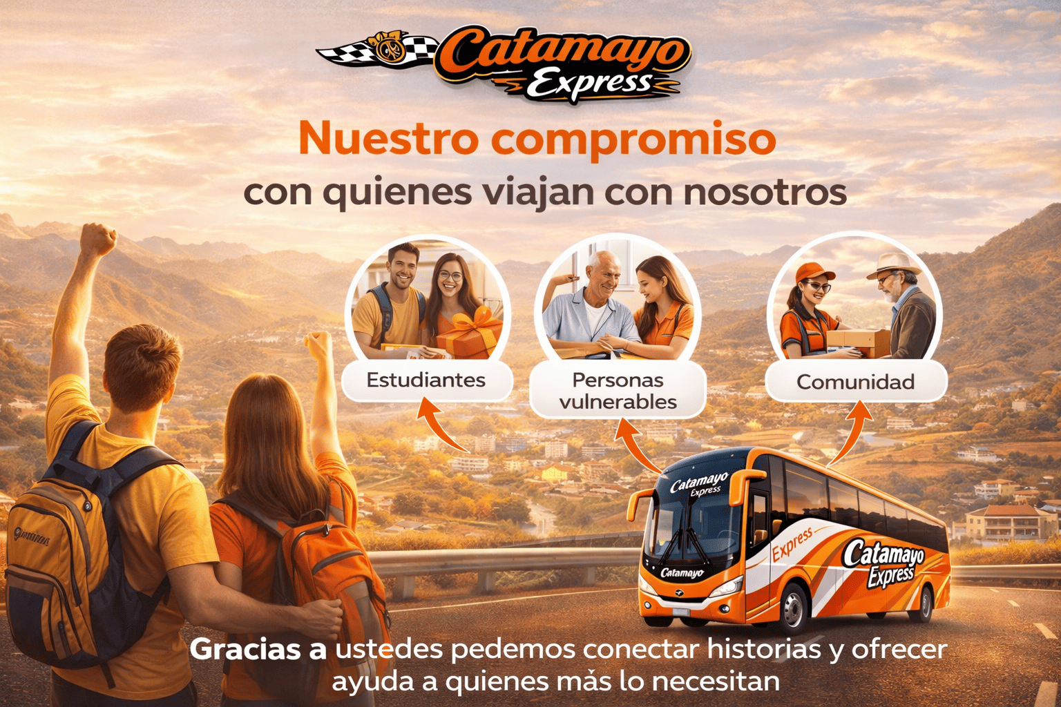 Cada persona que elige viajar con Catamayo Express contribuye a que podamos continuar desarrollando programas de apoyo para estudiantes, personas vulnerables y la comunidad en general.